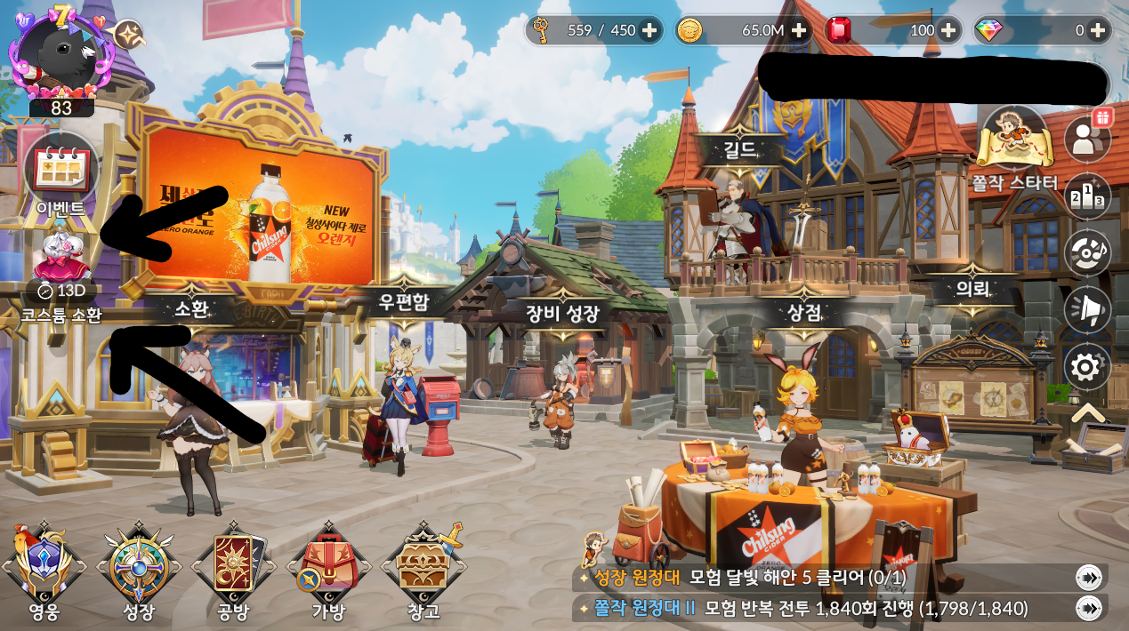 뽑기 메뉴는 게임 화면 왼쪽 상단에서 이벤트 아래에 코스튬 소환을 탭하시면 됩니다.